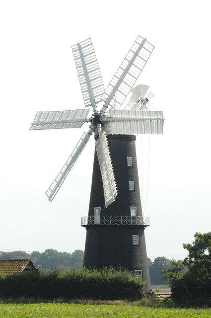 One of the few six-sailed mills remaining in England, Sibsey Windmill was built in 1877 to replace an earlier post mill. In its day it was the ‘Rolls Royce’ of windmills, and one of the very last to be built in Lincolnshire. It has been described as “one of the finest mills in the country, with its slender tower and elaborate wrought iron balcony.” It is not exceptionally tall, containing only six floors above ground. It worked until 1954, latterly with four sails and was then allowed to become derelict. It was taken over by English Heritage who restored it in 1970 to ‘static’ condition. In 1981 they got the mill into full working order.